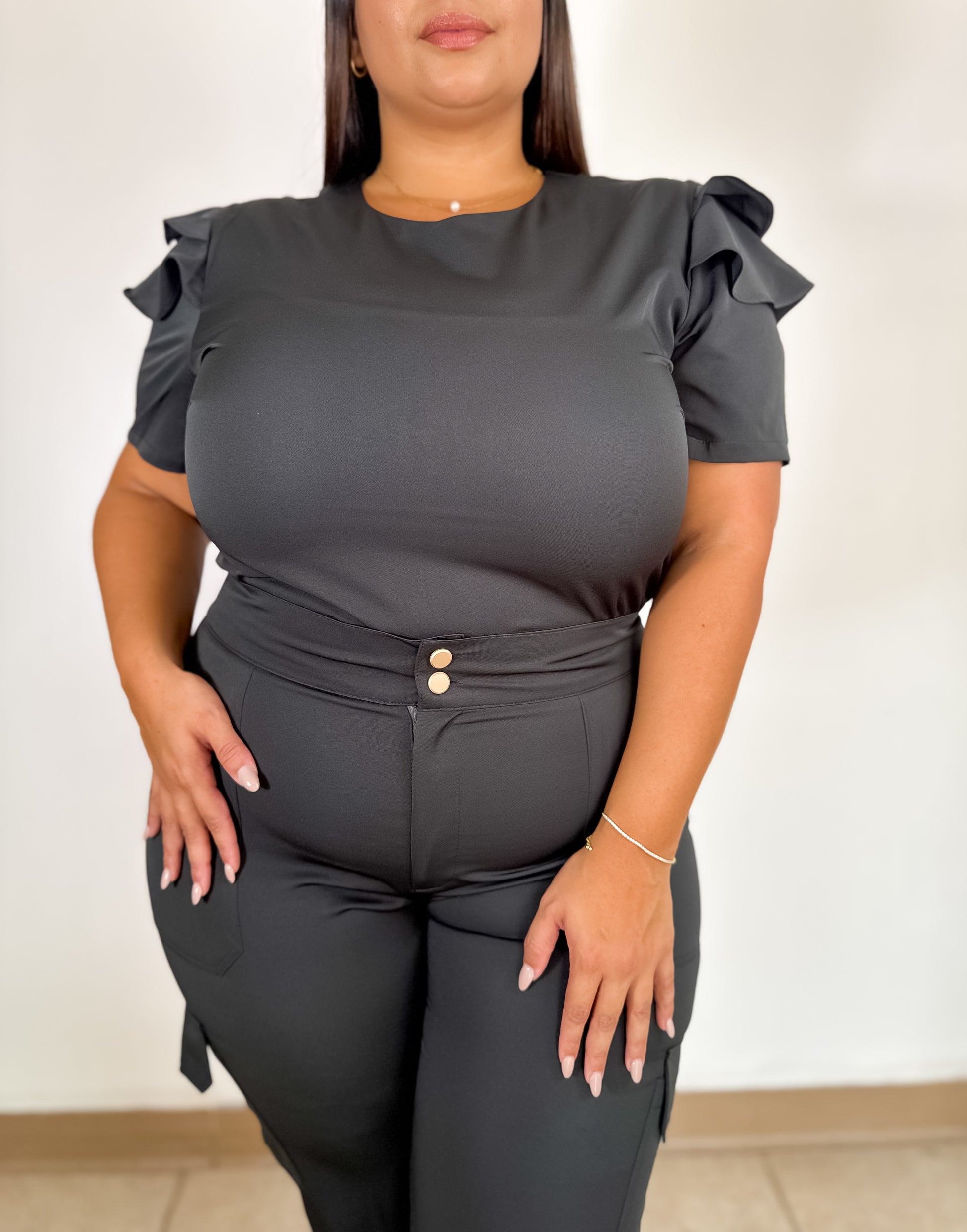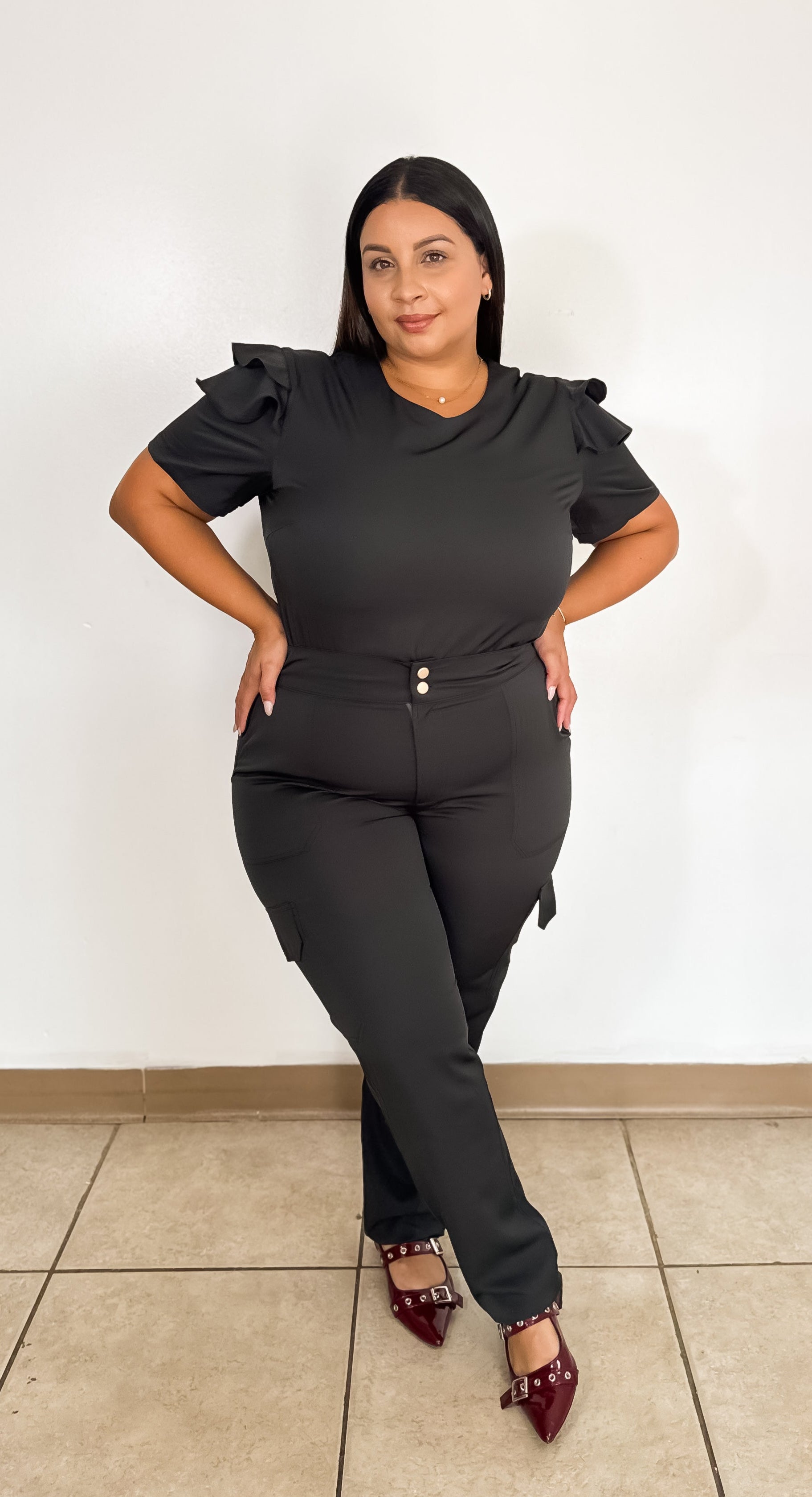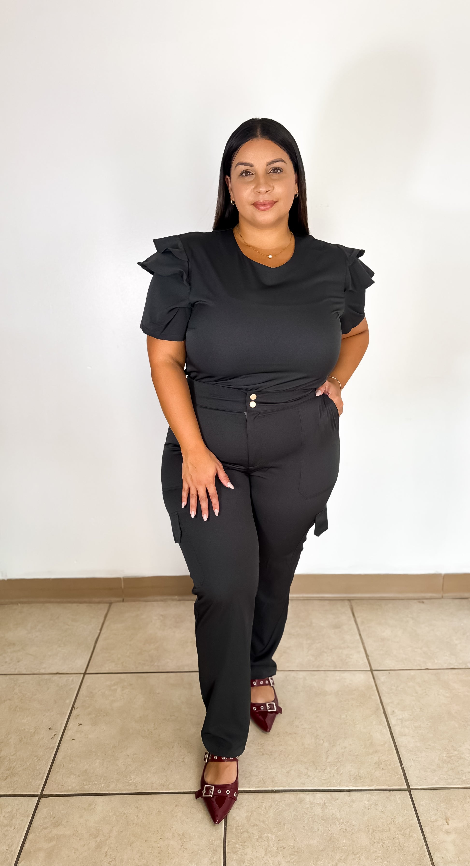 El uniforme Selena combina estilo y elegancia con un toque femenino gracias a sus mangas con volantes delicados, perfectos para quienes desean un look moderno sin perder la comodidad en su jornada de trabajo.